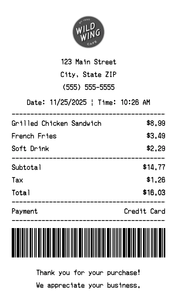 Use our free Wild Wing Cafe Receipt Maker to create professional receipts in seconds.