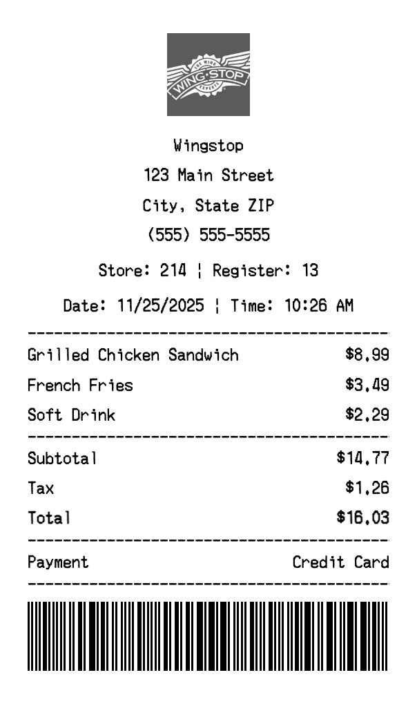 Create authentic Wingstop receipts for fast food purchases. Our free receipt generator tool helps you create professional, detailed receipts instantly. Perfect for business expense tracking, reimbursement requests, and personal documentation. Download high-quality PNG receipts in seconds, no signup required.