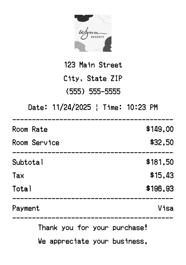 Create authentic Wynn Resorts receipts for hotel purchases. Our free receipt generator tool helps you create professional, detailed receipts instantly. Perfect for business expense tracking, reimbursement requests, and personal documentation. Download high-quality PNG receipts in seconds, no signup required.