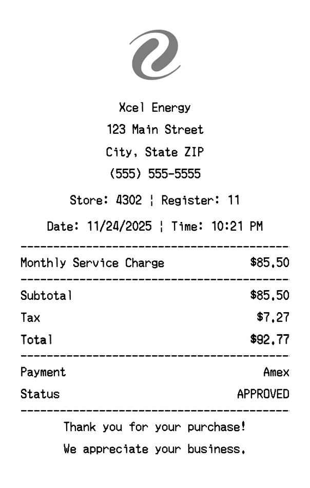 Create authentic Xcel Energy receipts instantly. Our free receipt generator produces professional energy receipts with company logo, itemized purchases, tax calculations, and payment details. Perfect for expense tracking, reimbursement, and documentation. Download high-quality PNG receipts in seconds.