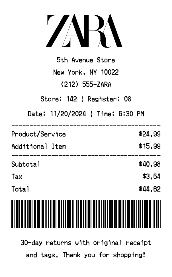 Create authentic Zara receipts for fashion & retail purchases. Our free receipt generator tool helps you create professional, detailed receipts instantly. Perfect for business expense tracking, reimbursement requests, and personal documentation. Download high-quality PNG receipts in seconds, no signup required.