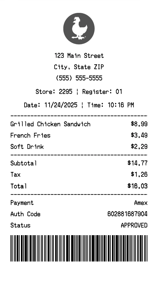 Create authentic Zaxby's receipts instantly. Our free receipt generator produces professional fast food receipts with company logo, itemized purchases, tax calculations, and payment details. Perfect for expense tracking, reimbursement, and documentation. Download high-quality PNG receipts in seconds.