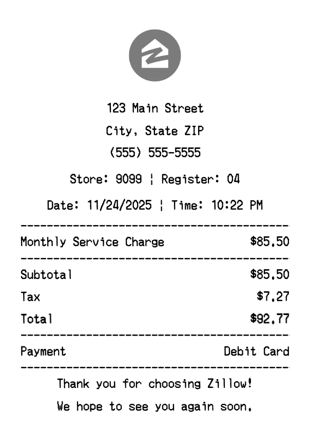 Create authentic Zillow receipts for real estate purchases. Our free receipt generator tool helps you create professional, detailed receipts instantly. Perfect for business expense tracking, reimbursement requests, and personal documentation. Download high-quality PNG receipts in seconds, no signup required.