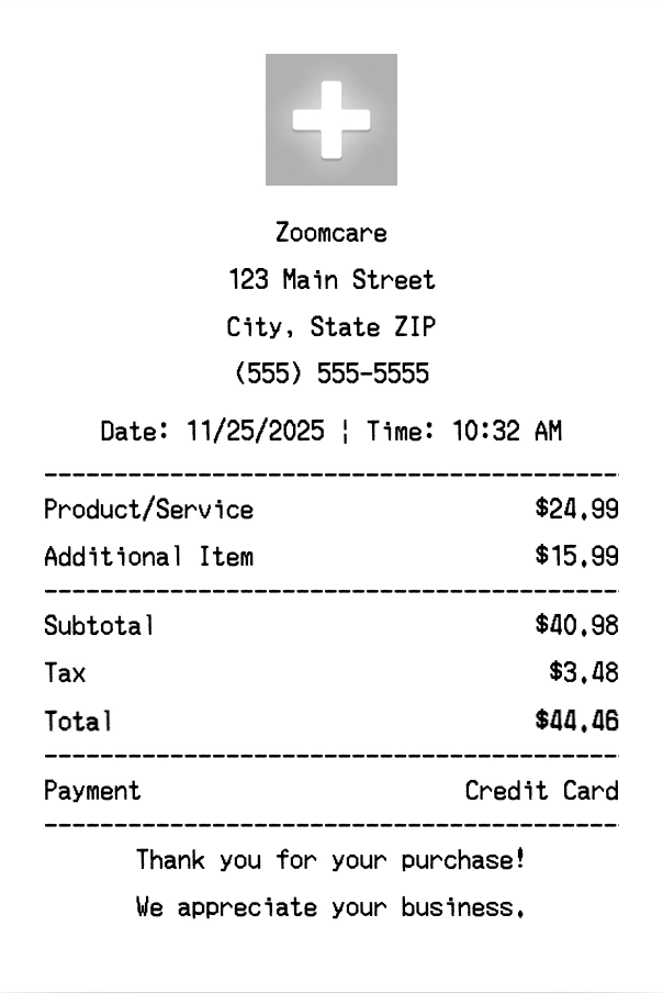 Create authentic Zoomcare receipts instantly. Our free receipt generator produces professional urgent care receipts with company logo, itemized purchases, tax calculations, and payment details. Perfect for expense tracking, reimbursement, and documentation. Download high-quality PNG receipts in seconds.